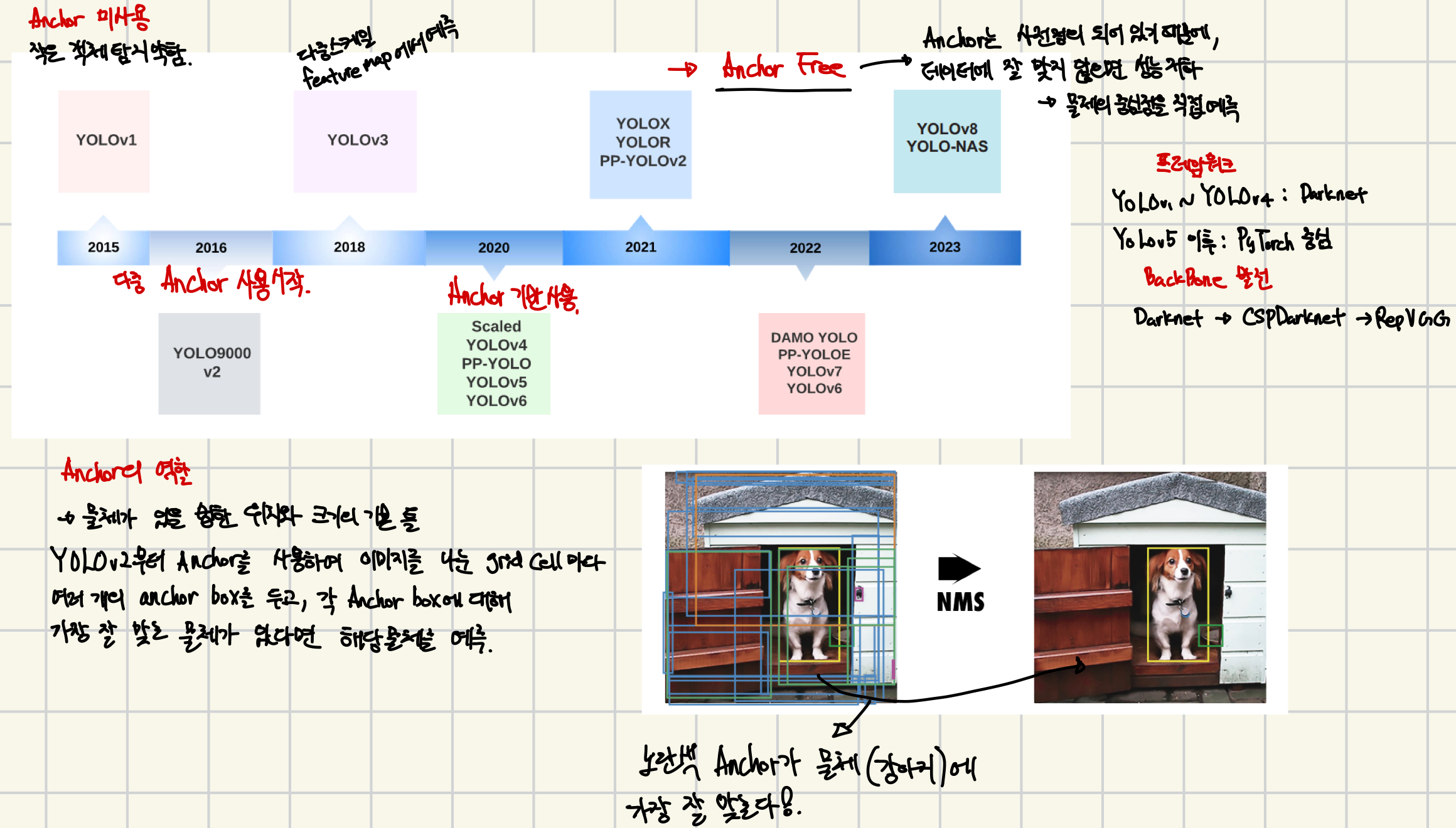 | Head | 객체의 클래스, 위치, confidence를 예측 | Anchor 기반 |