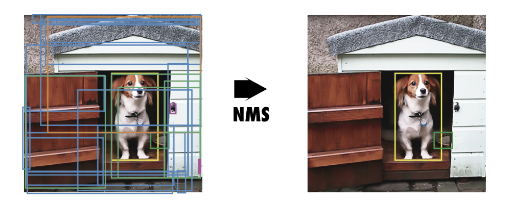 - NMS는 신뢰도가 가장 높은 박스를 남기고, IoU가 높은 나머지 박스는 제거