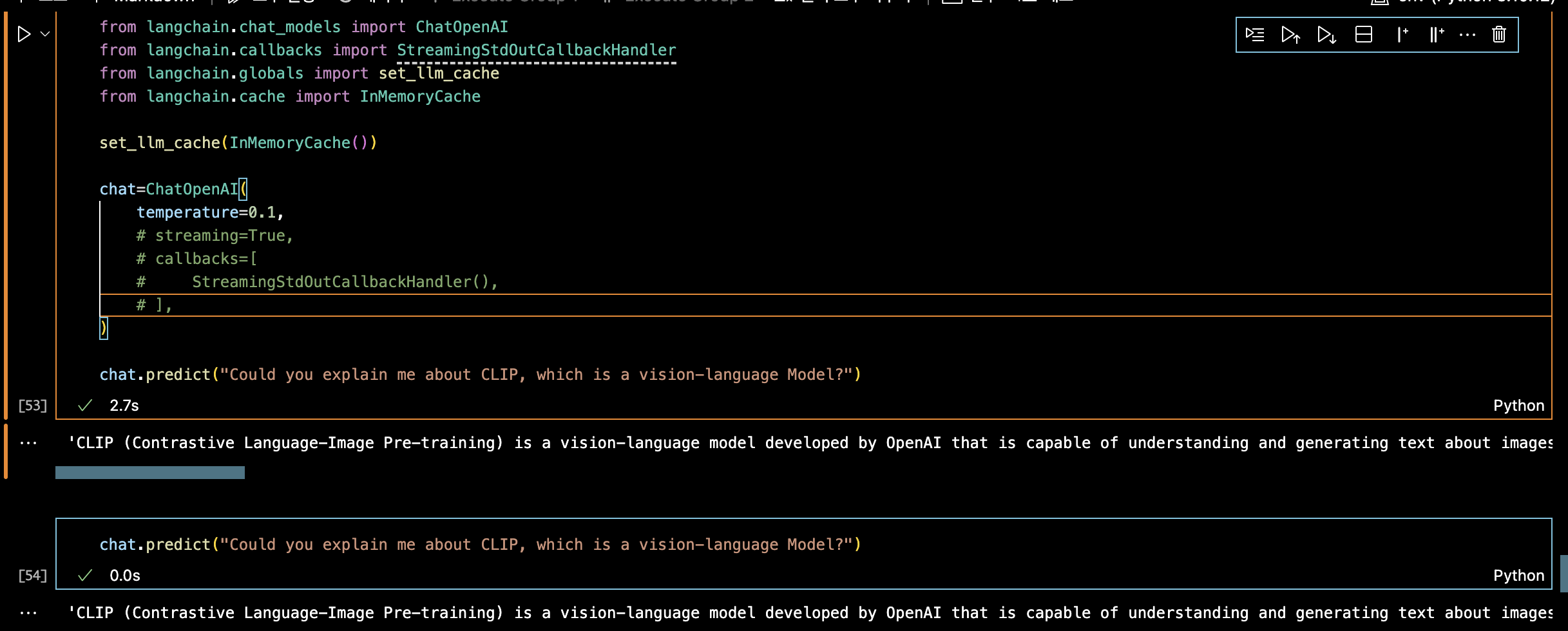- set_llm_cache를 통해 이전에 물어본 질문을 다시 물어보면 답변을 하는 속도가 눈에 띄게 빨라짐