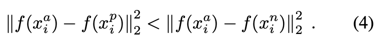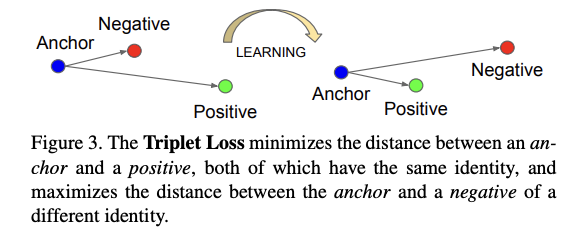 여기서 어떠한 특정 사람의 이미지 x^a (anchor)와 동일한 사람의 또 다른 이미지 x^p (positive) 사이의 거리가 다른 사람의 이미지 x^n (negative) 사이의 거리보다 가까워지도록 학습한다. (아래의 사진에서 확인 가능)