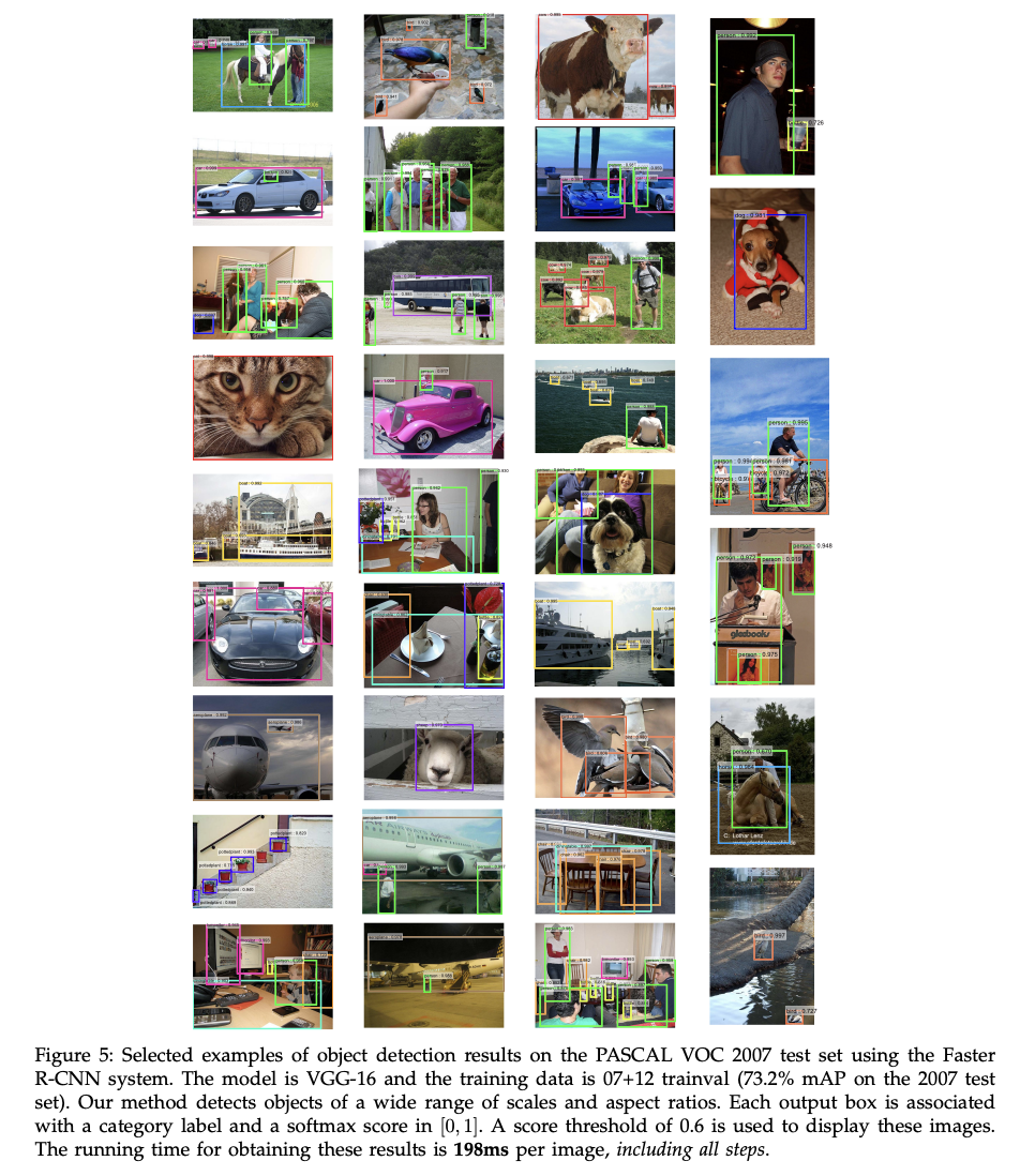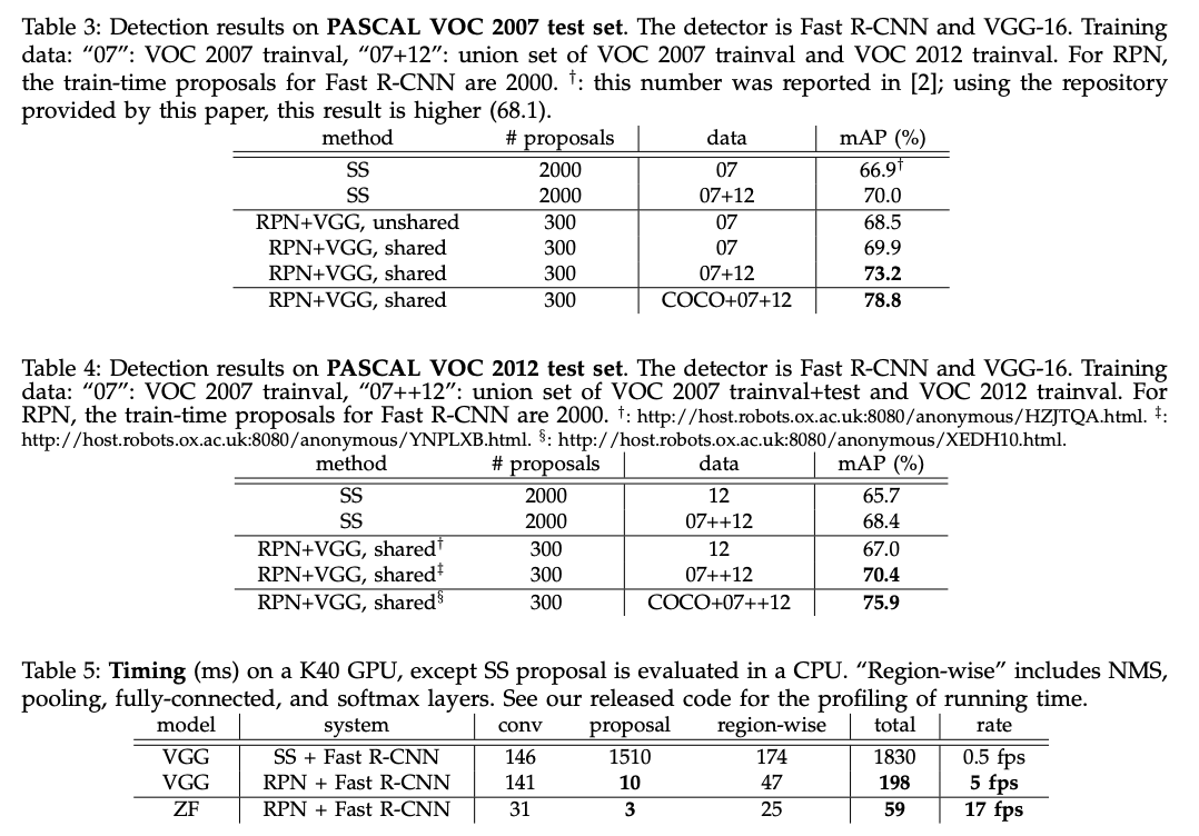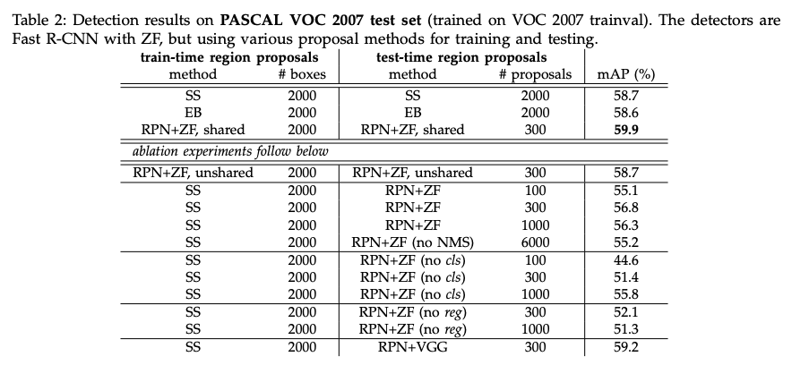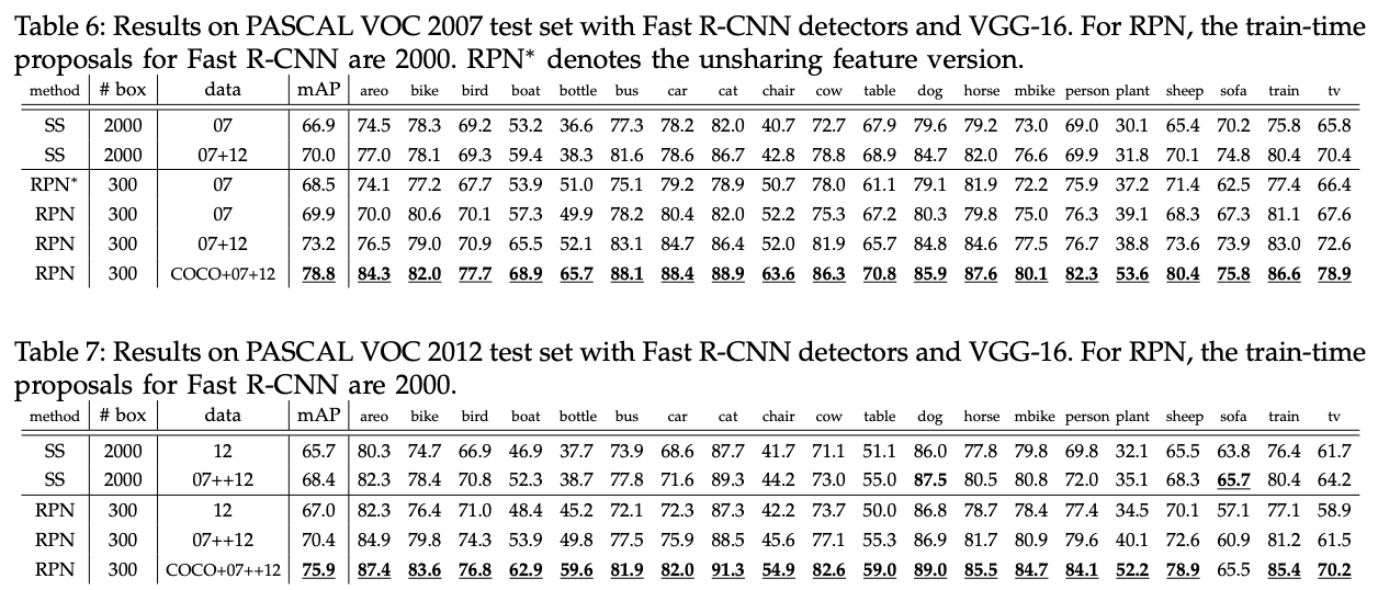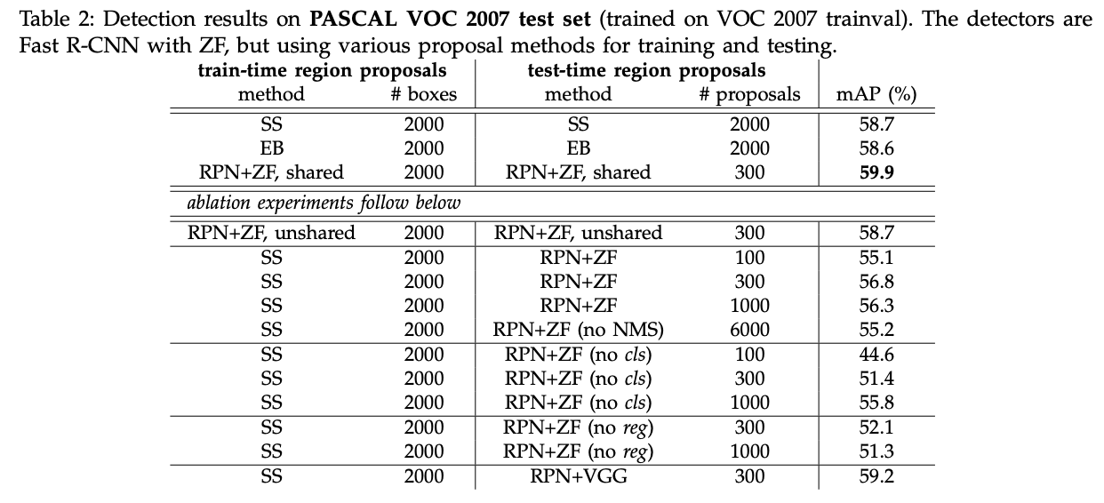 - PASCAL VOC 2007, 2012 ๋ฐ์ดํฐ ์ ์ผ๋ก ๋ RPN๊ณผ Detection Network๋ฅผ ๋ ํ์ต์์ผฐ์ ๋, mAP๋ 73.2%์๋ค.