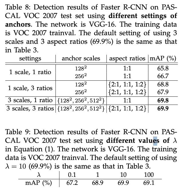 - ๊ธฐ๋ณธ๊ฐ : 3 scales x 3 aspect ratios โ mAP = 69.9%