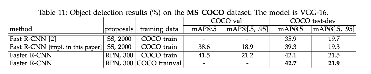 - Faster R-CNN์ Fast R-CNN ๋๋น mAP@0.5์์ +2.8%, mAP@[.5, .95]์์ +2.2% ๊ฐ์