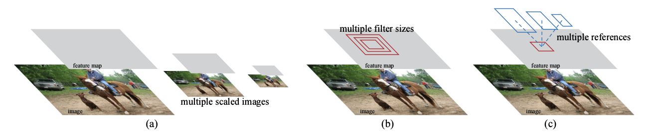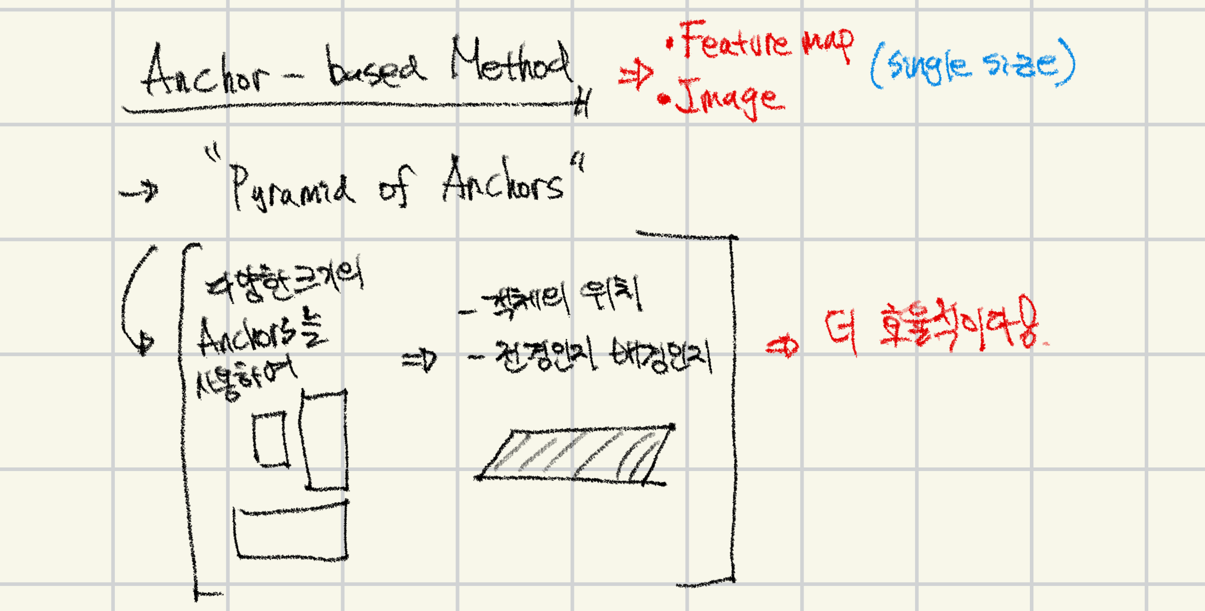- ๋ค์ํ ํฌ๊ธฐ์ ๋ํด ์ด๋ฏธ์ง, ํํฐ๋ค์ ๊ณ์ฐํ ํ์ ์์ด ๊น์๋ anchor box๋ฅผ ํตํด ๊ฐ์ฒด์ ์์น๋ฅผ ์์ธกํ๋ค.