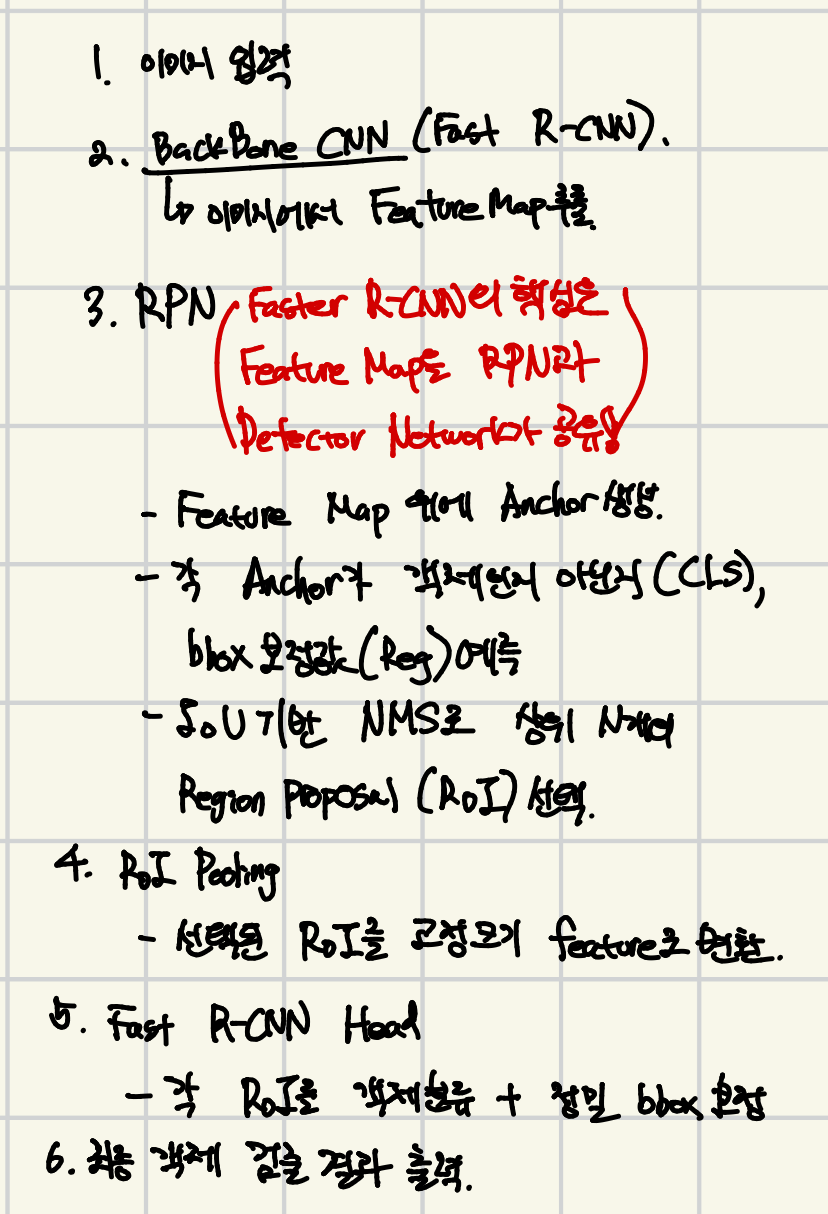 - Stage 2: Fast R-CNN์ด proposal ๊ธฐ๋ฐ์ผ๋ก ํด๋์ค + bbox ์์ธก