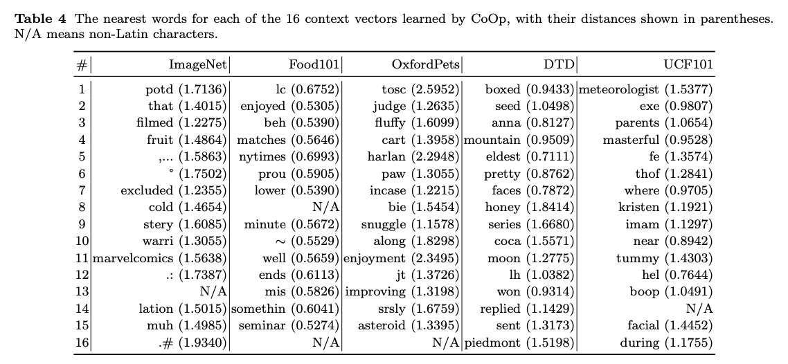 따라서, CoOp가 학습한 벡터는 인간의 사전에 있는 단어로는 완벽하게 표현할 수 없는 그 이상의 의미를 가지고 있다고 표현