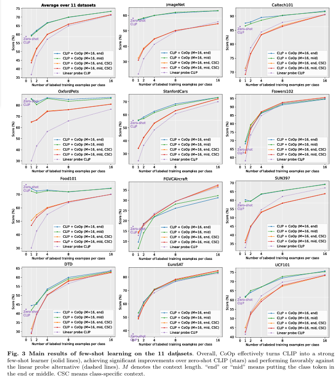 - 결과적으로 CoOp (논문에서 제안하는 전이학습 방식)은 CLIP을 강한 few-shot learner로 효율적으로 바꿈