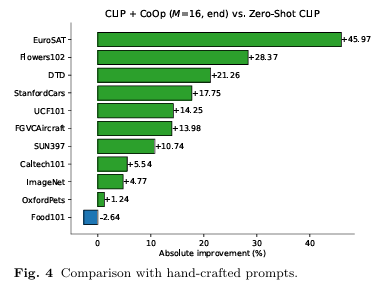 - 가장 성능을 끌어올리기 힘든 ImageNet 데이터셋에 대해서 4.77%의 성능 향상을 이룬 것과, EuroSAT, DTD와 같은 특정 분야에서 각각 45%, 20%의 성능 향상을 가져온 것은 CoOp가 얼마나 효율적인 방식인지를 입증