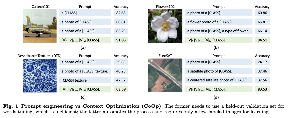 - 프롬프트 엔지니어링을 자동화 (CLIP 과 같이 사전학습된 VIsion-Language Model을 위해)