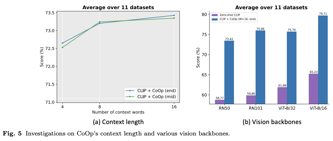 - 어떠한 백본 아키텍처에도 CoOp 방식으로 생성된 프롬프트와 hand-crafted 프롬프트 사이의 차이는 명확하다.