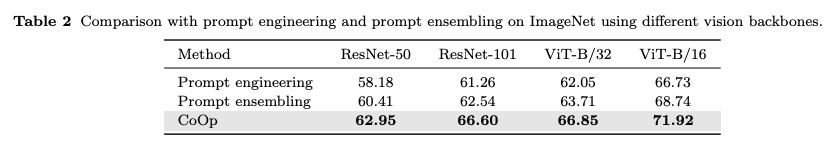 → CoOp으로 생성된 프롬프트들은 Prompt Ensembling 한 것과 비교하였을 때 이점이 있는지 확인