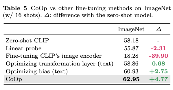 CLIP에 transformation layer를 추가해도, 편향을 최적화하는 방식으로 CLIP을 Fine-Tuning해도, 그 성능은 CoOp를 넘지 못했다.